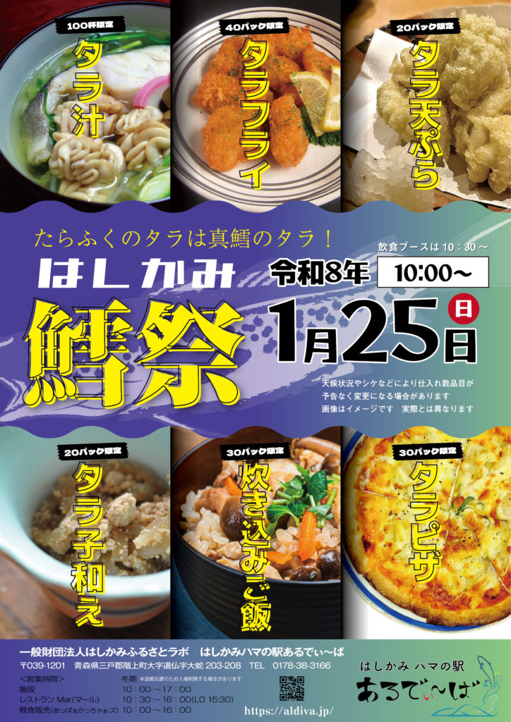 イベント 【1/25】あるでぃ~ば タラ祭 2026年1月21日 hashikamidonko2 主催はしかみハマの駅あるでぃ~ば問合せ先0178-38-3166開催場所はしかみハマの駅あるでぃ~ば敷地内あるでぃ~ば内レストランMarイベントオフィシャル(公式)サイトhttps://aldiva.jp/ 近くのおすすめスポット