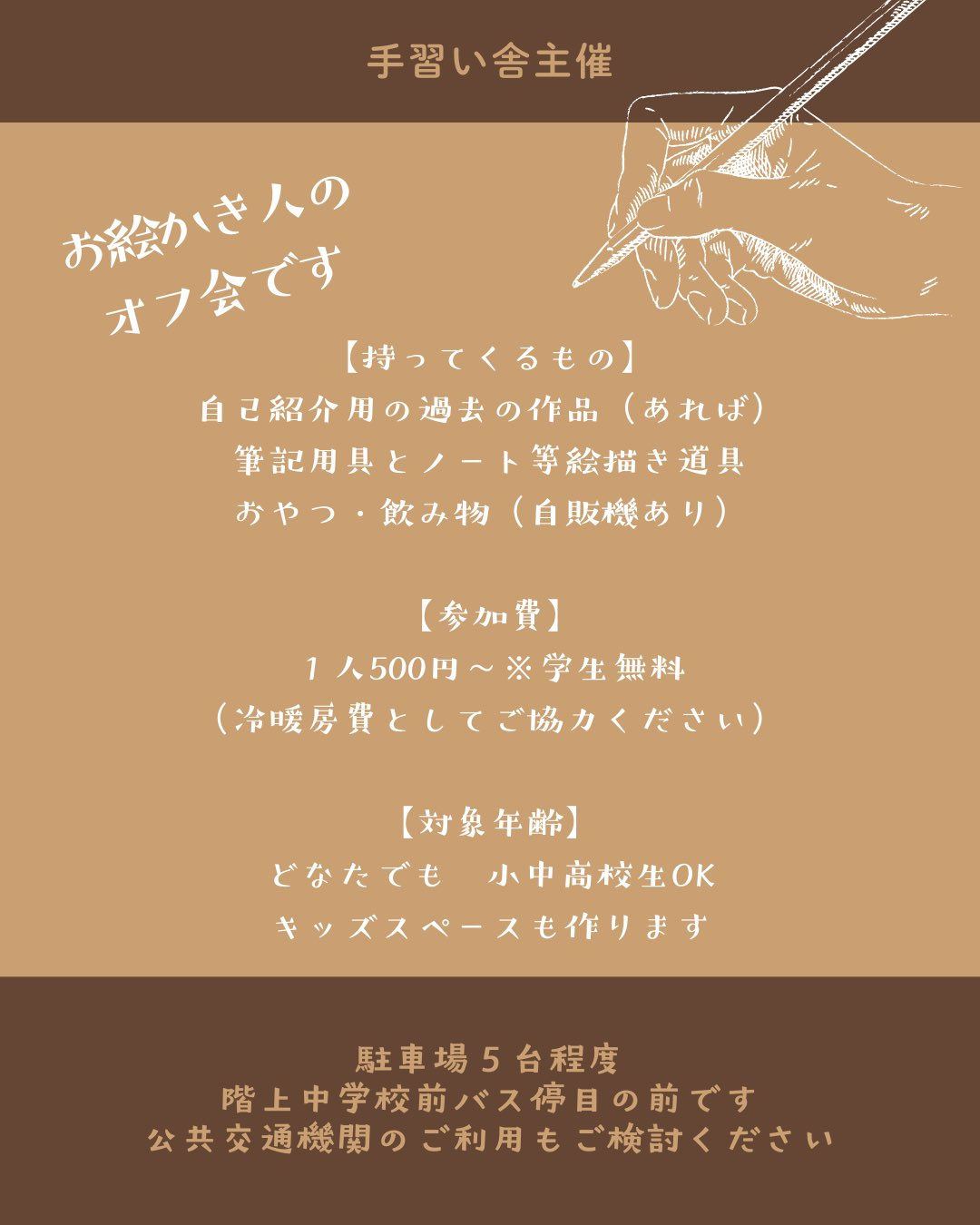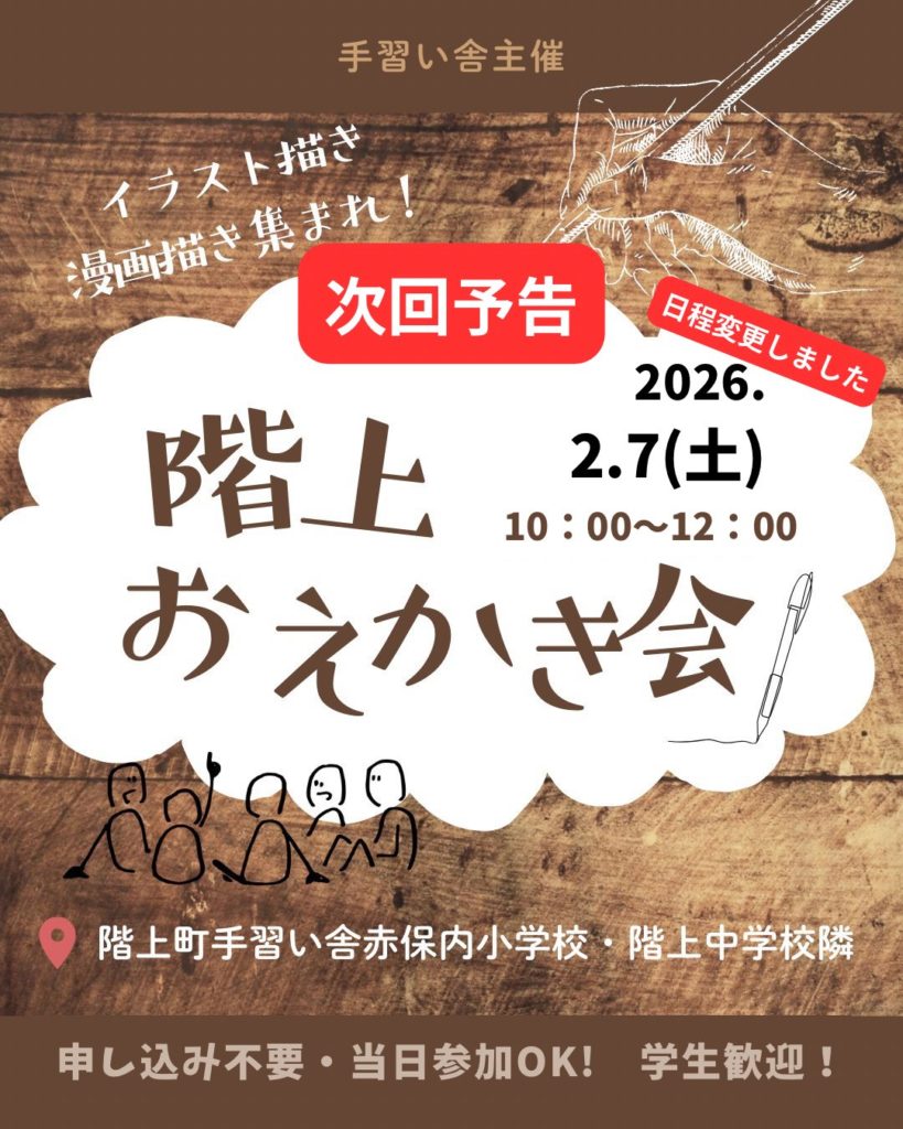 【日程変更】2026/2/7(土) AMはしかみお絵かき会(主催:手習い舎)by tenaraisyain イベントon Posted on 2025年11月15日2026年1月8日 【日程変更のお知らせ】同日に前回延期になったおでん部イベントのリトライイベントと日程が被ったため、2/7(土)に変更します。都合で申し訳ありませんが、リスケジュールよろしくお願いいたします。【予告】次回お絵かき会は2026年1月17日(土)10:00〜12:00【日程変更】☞2026年2月7日(土)10:00〜12:00を予定しております。おそらく雪で外で遊ぶのも大変と思いますので、あったか室内でお絵描きの算段です💪習字で好き勝手書くフリーダム書き初めも併催します。
