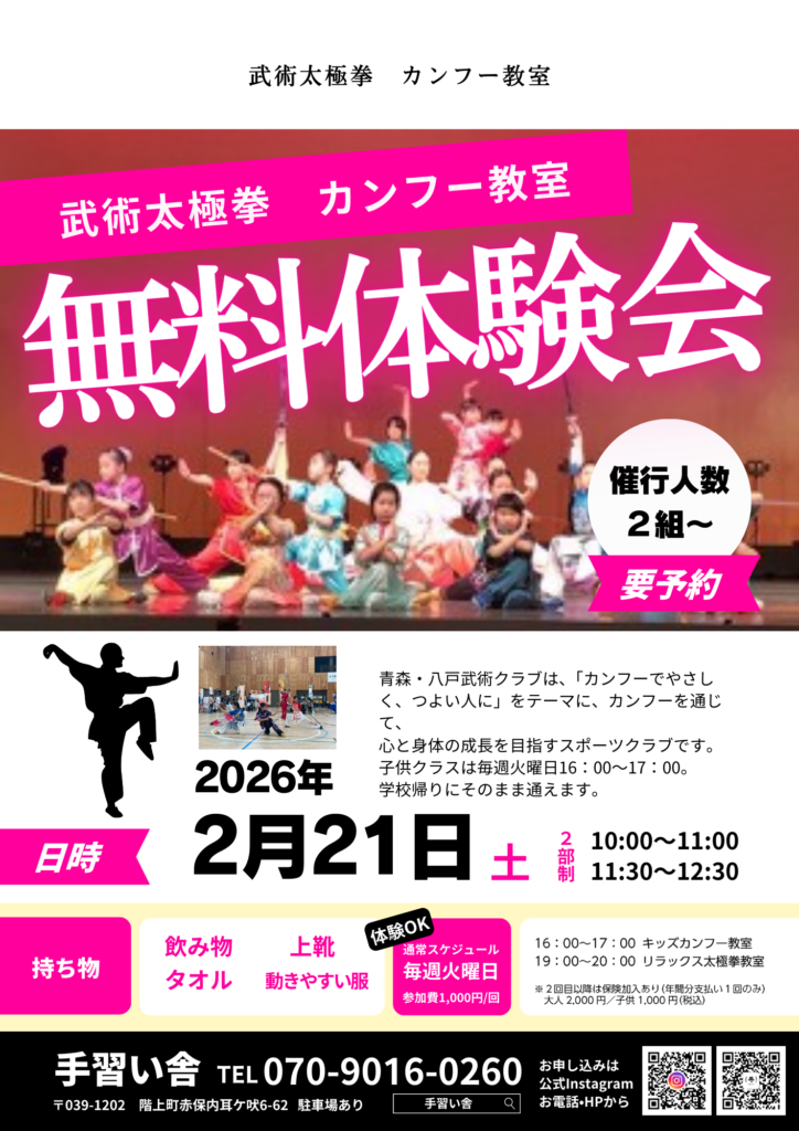 2026/2/21 カンフー(武術太極拳)無料体験会by tenaraisyain イベントon Posted on 2026年1月8日2026年1月8日 お申し込みはこちらから Please enable JavaScript in your browser to complete this form.Please enable JavaScript in your browser to complete this form.名前 *メールアドレス *電話番号 *お問い合わせ内容 *体験のお申込み・お問い合わせキッズカンフー教室への入会大人カンフー教室への入会その他 コメントまたはメッセージ お問い合わせ内容 電話番号 コメントまたはメッセージ送信