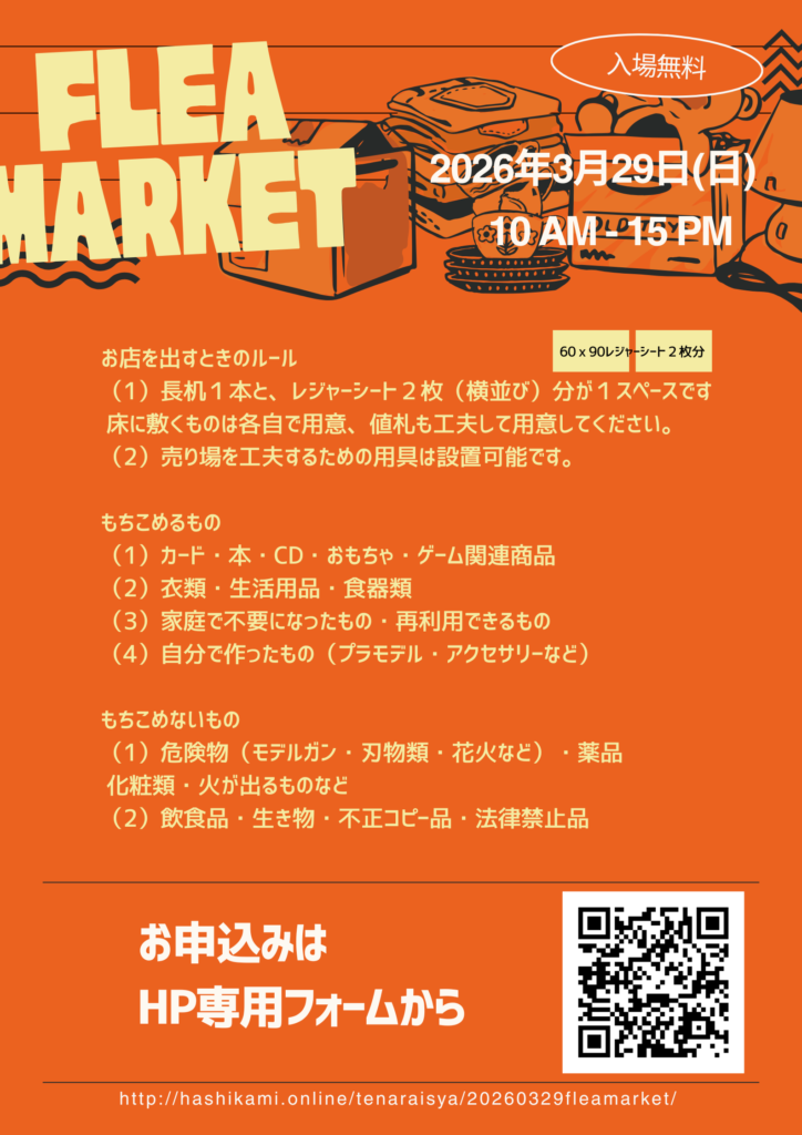 2026/3/29 フリーマーケット(主催:手習い舎)by tenaraisyain イベントon Posted on 2026年1月5日2026年1月26日 2026年3月29日㊐ 10:00~15:00フリーマーケットin手習い舎年末大掃除や季節の入れ替えで不要になったもの、ありませんか?フリーマーケットを通して、リサイクルやアップサイクルといった取り組みを大切にしながら、モノを大事にする気持ちを共有できる、地域のみなさまにとって気軽に集える交流の場をつくりたいと考えています。まだ十分に使える、着ることができるにもかかわらず、手放すかどうか迷っているモノがありましたら、必要とする方との出会いにつながる場になるはずです。学用品やおさがりなども大歓迎。ぜひご参加ください。▼お申し込みフォームはこちら Please enable JavaScript in your browser to complete this form.Please enable JavaScript in your browser to complete this form.名前 *メールアドレス *電話番号 *出品物内容 *コメントまたはメッセージ 名前 メールアドレス 出品物内容 参加料1,000円を当日現金で支払うことに同意します *同意する送信