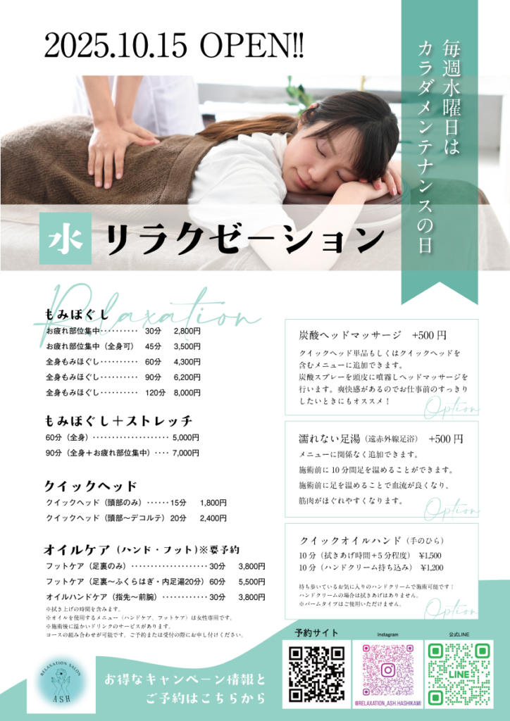 「リラクゼーションASH」は、低価格×高品質のリラクゼーションを実現した「お疲れの身体の憩いの場」です♪